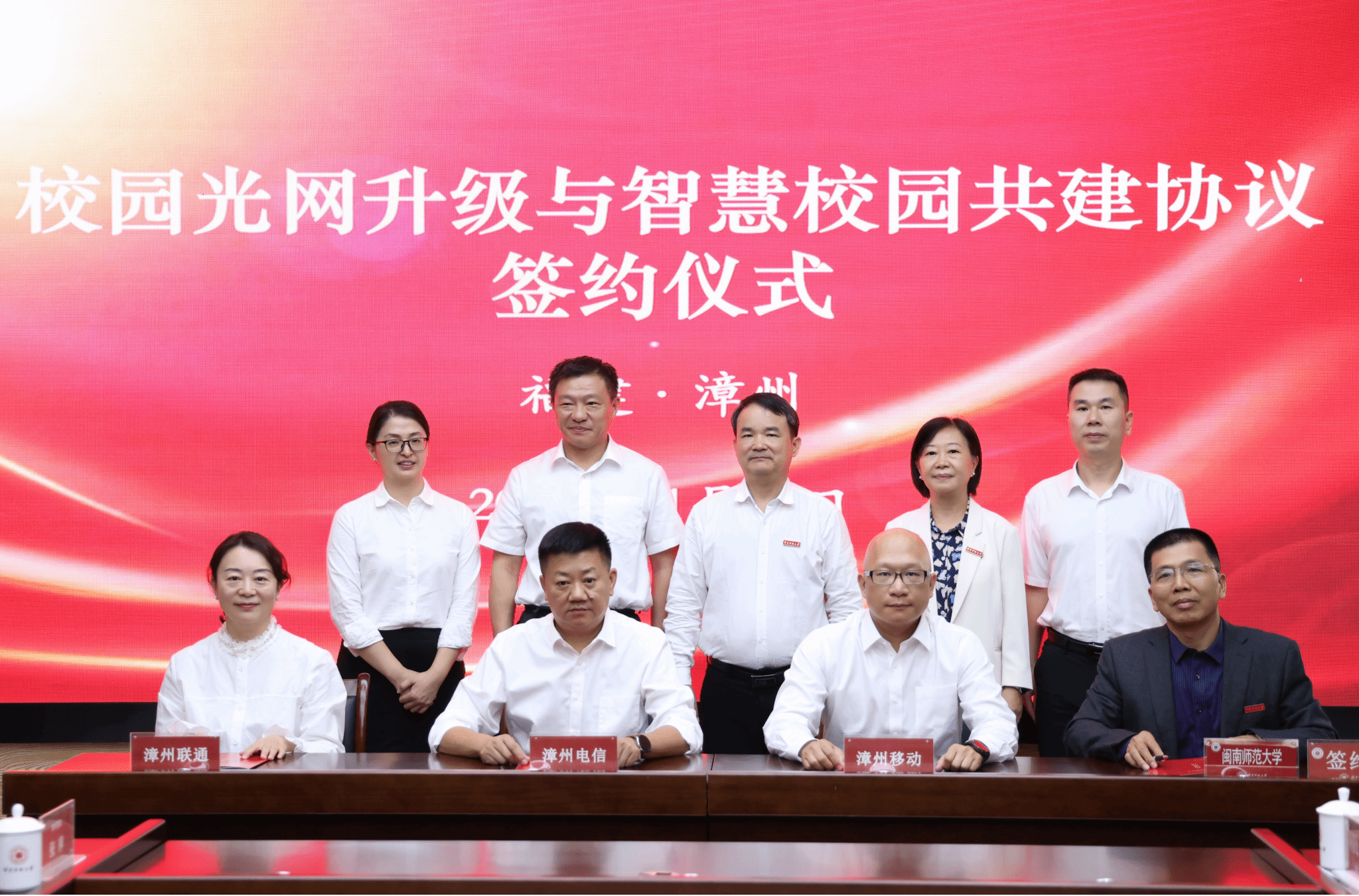 最后,在与会领导的共同见证下,信息化建设与管理办公室主任蔡如兴代表学校与漳州移动公司、漳州电信公司、漳州联通公司分别签署“校园光网升级与智慧校园共建协议”。